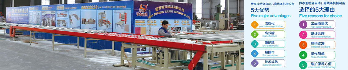 临沂周兴建材(玉兴机械)有限公司始建于2001年7月,专业研发、生产全自动铝蜂窝板生产线,全自动石膏线条生产设备,石膏吸音板,石膏板冲孔机,PVC贴面石膏天花板机械(pvc贴面石膏板设备),主要包含:自动上板机,双面覆膜机,自动分切锯,自动包边机,多用途自动打包机,全自动码垛机等。